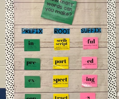 MCS teachers are finding creative ways to make morphology instruction meaningful and engaging for students. Heritage 3rd grade teacher Beth Mattingly had students create a spiral notebook with 3 sections to represent the prefix, root, and suffix. Students flip the pages allowing different prefixes/root/suffixes to work together creat ing words. Mattingly said, “ What has been empowering is when the students 'see' a new word and get excited. It's fun to watch them try to create new words too. They then get super excited to figure out what it means based on the pre/root/suffix. It's great when we are reading and they start noticing words with the prefix/suffix and get excited. I'm excited because they are more aware. Ultimately the end goal will be reached when they come across words as they progress in their reading growth and can figure them out thanks to the lessons we provided.”